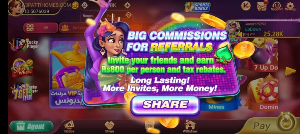 3 Patti Gold strongly rewards referrals. Each user receives a unique referral link to share with friends. When a referred player registers, deposits, and plays, the referrer can earn commissions of up to PKR 1,000. Additionally, users continue earning a percentage of their referrals’ gameplay activity, creating a long-term passive income opportunity.